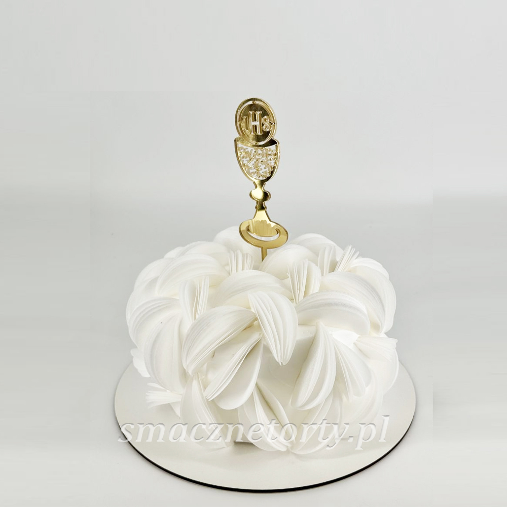 Tort bez masy cukrowej, złoty topper kielich komunijny